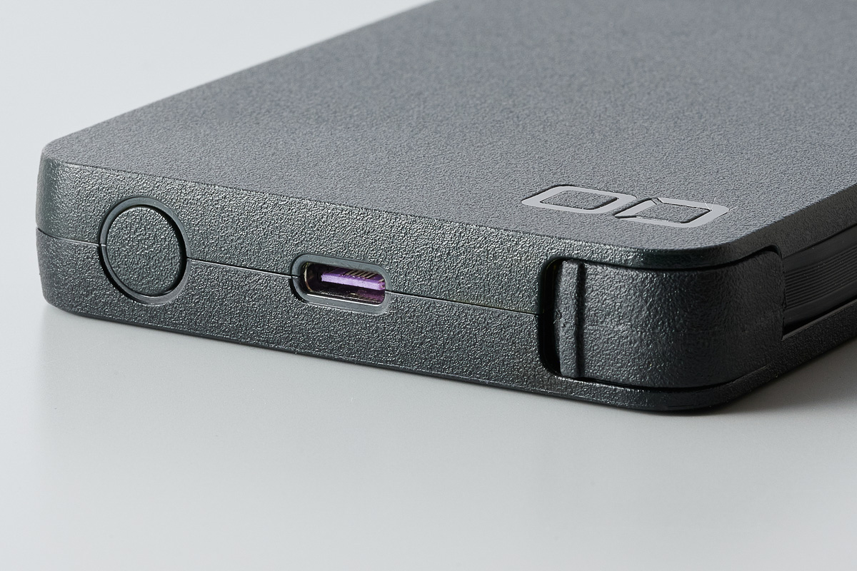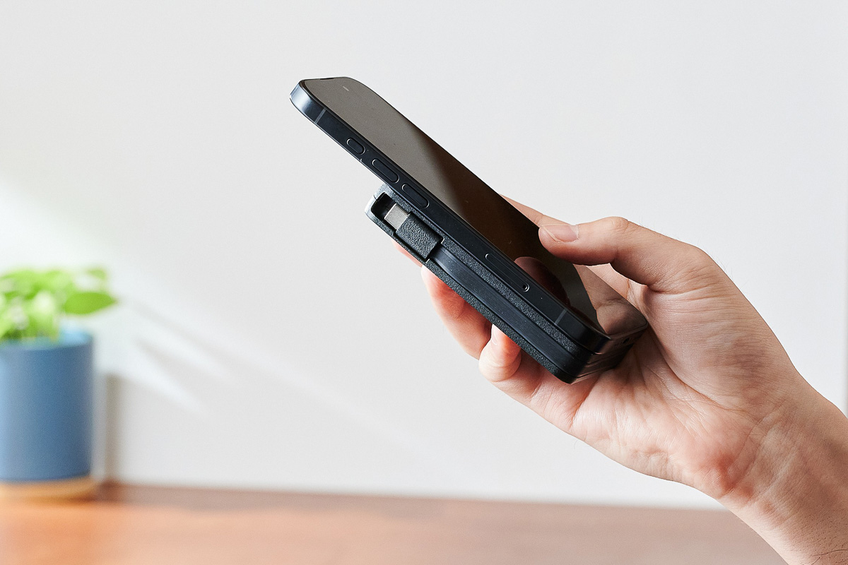 コンパクトなボディと、1日分をしっかり充電できる容量の、バランスのよさが特徴のこのモデル。本体サイズは約100×70×14mmとスマホ幅よりスリムなので、MagSafeでスマホにくっつけて重ね持ちしても手に収まりやすく、充電しながらズボンのポケットに入れてもかさばりにくいサイズ感です。
