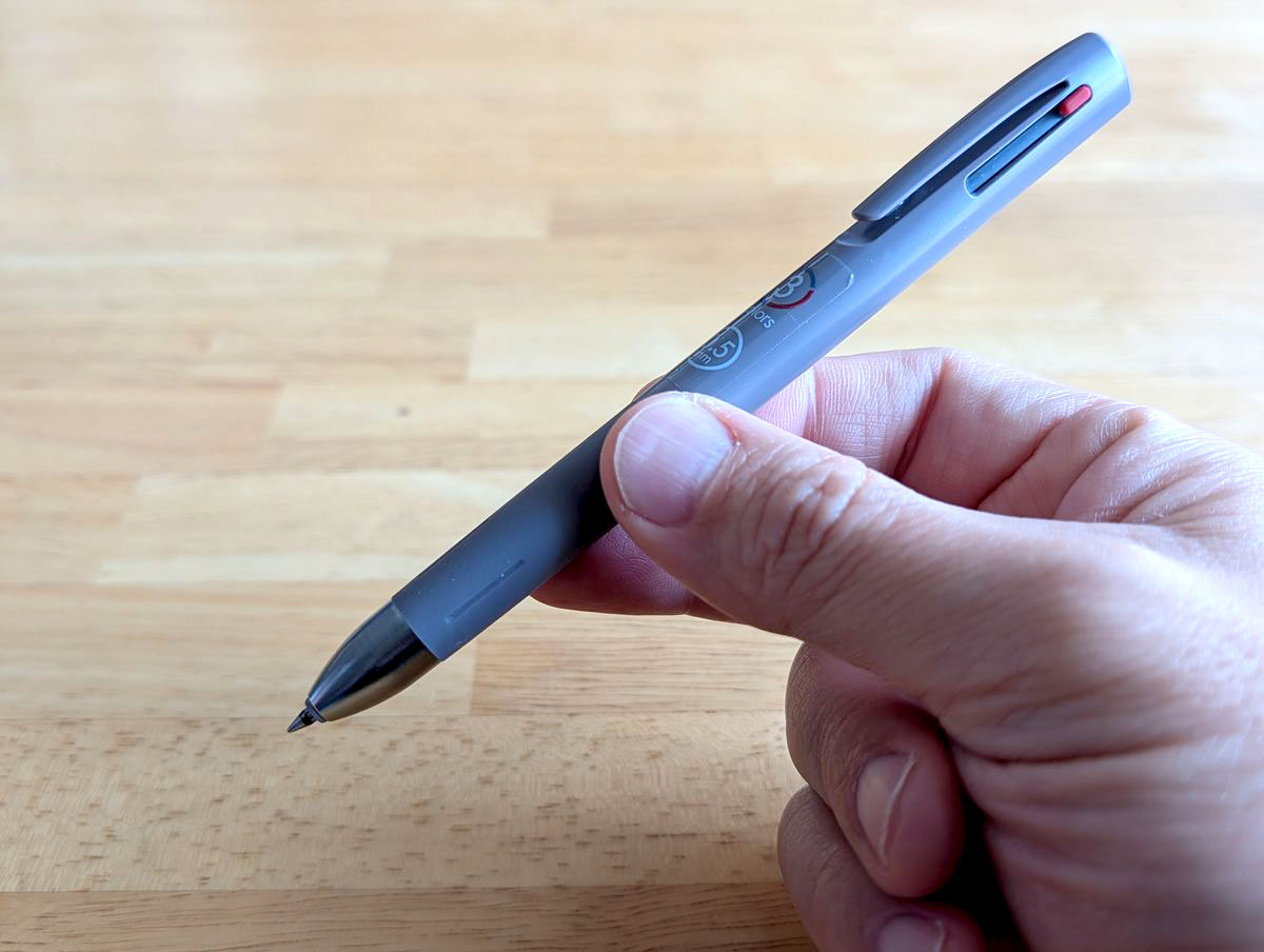 3Cという黒赤青の3色タイプ。以前と比べて手書きする機会が減ったことから、ペンケースは使わないようになりました。とはいえ、たまに必要なことがあります。そんな時に困らないように、普段使っているバッグ(3つほど)のポケットに1本入れておくことにしました。そこで買い足したのがこの「ブレン3C」。