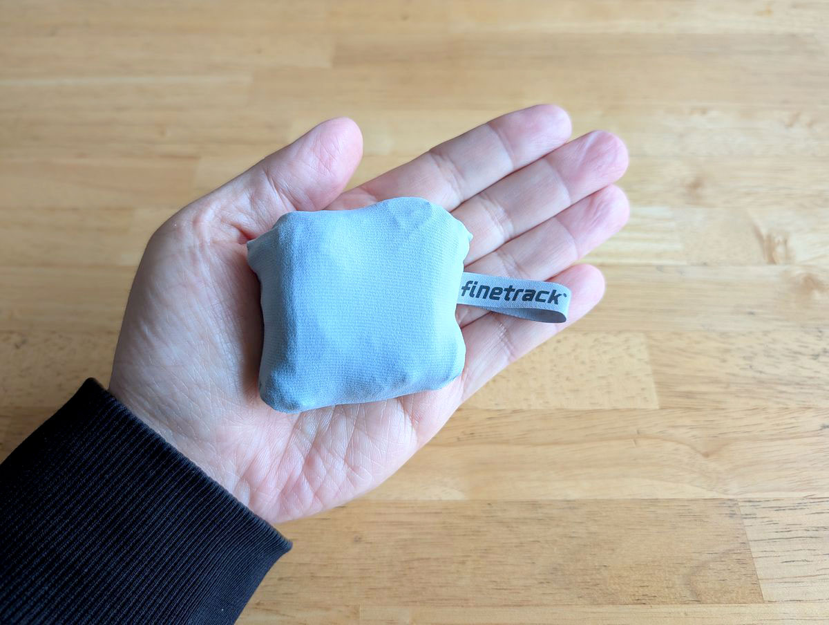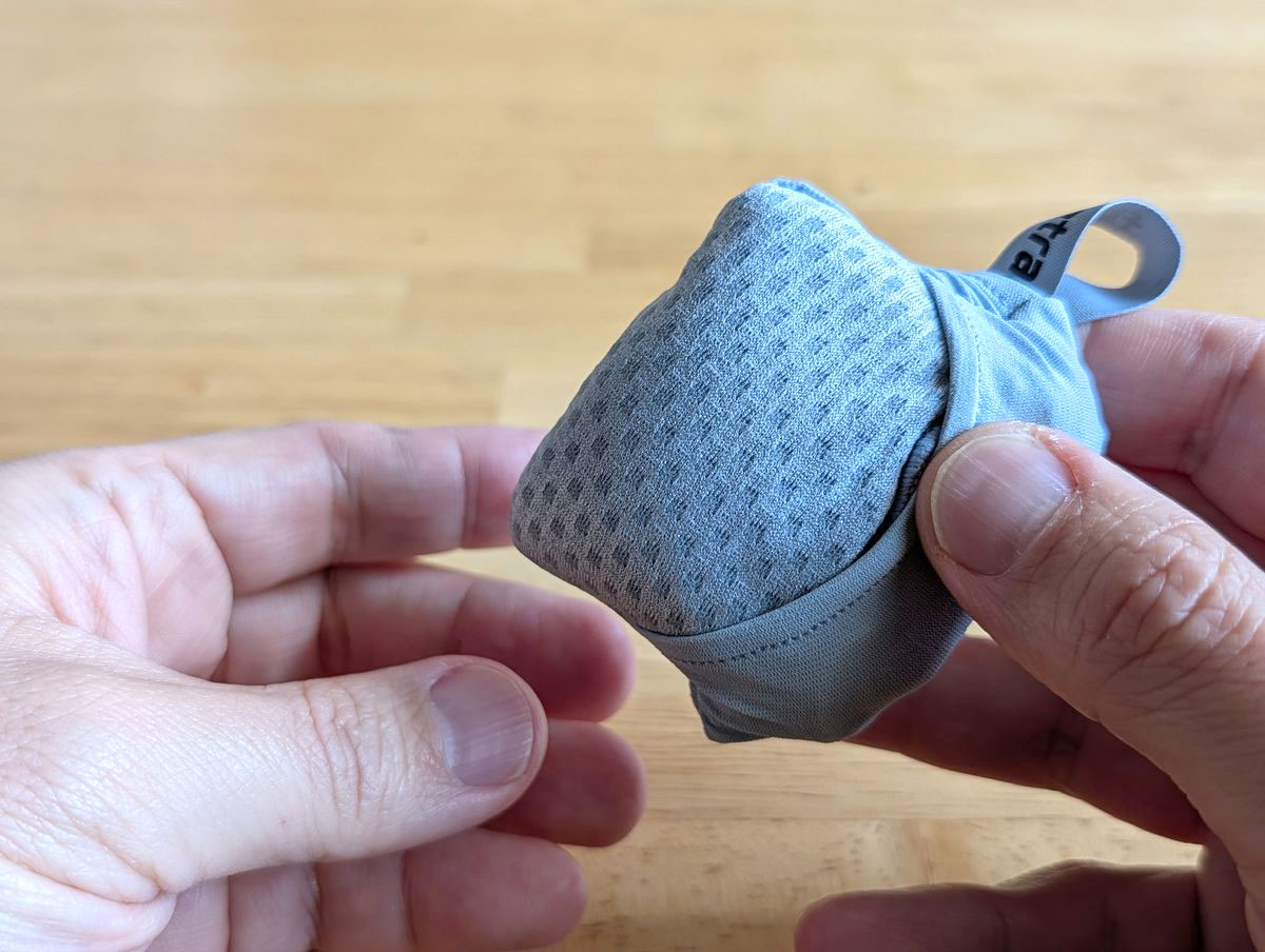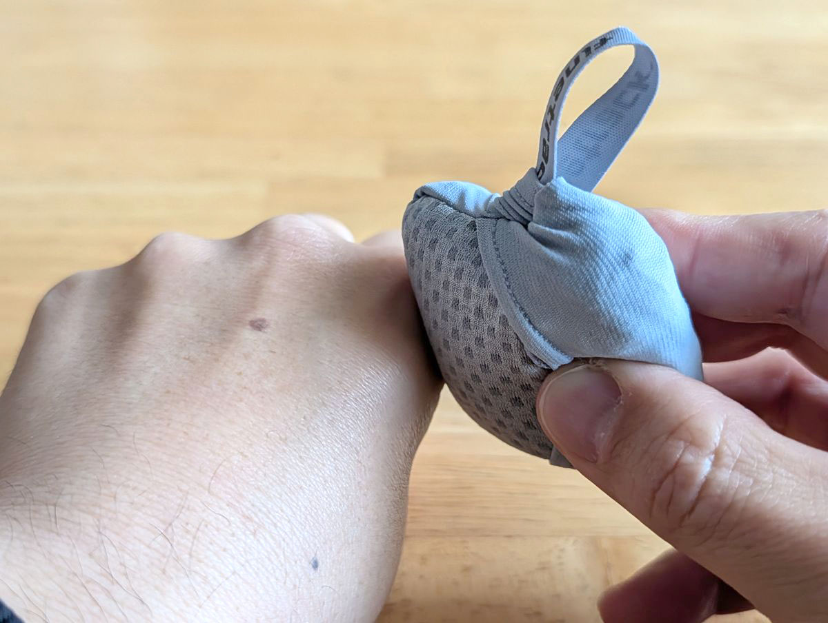 透けるぐらい薄く、隙間のあるマイクロ繊維製なので速乾性があり軽い。袋に入れればかなり小さくなり、カラビナを付けてバッグにぶら下げることも可能と、さすがアウトドア用といった機能性です。サイズは開くと32×32cmとかなり大きい。まだ汗をかく季節ではないですが、この夏は大活躍してくれそうです。