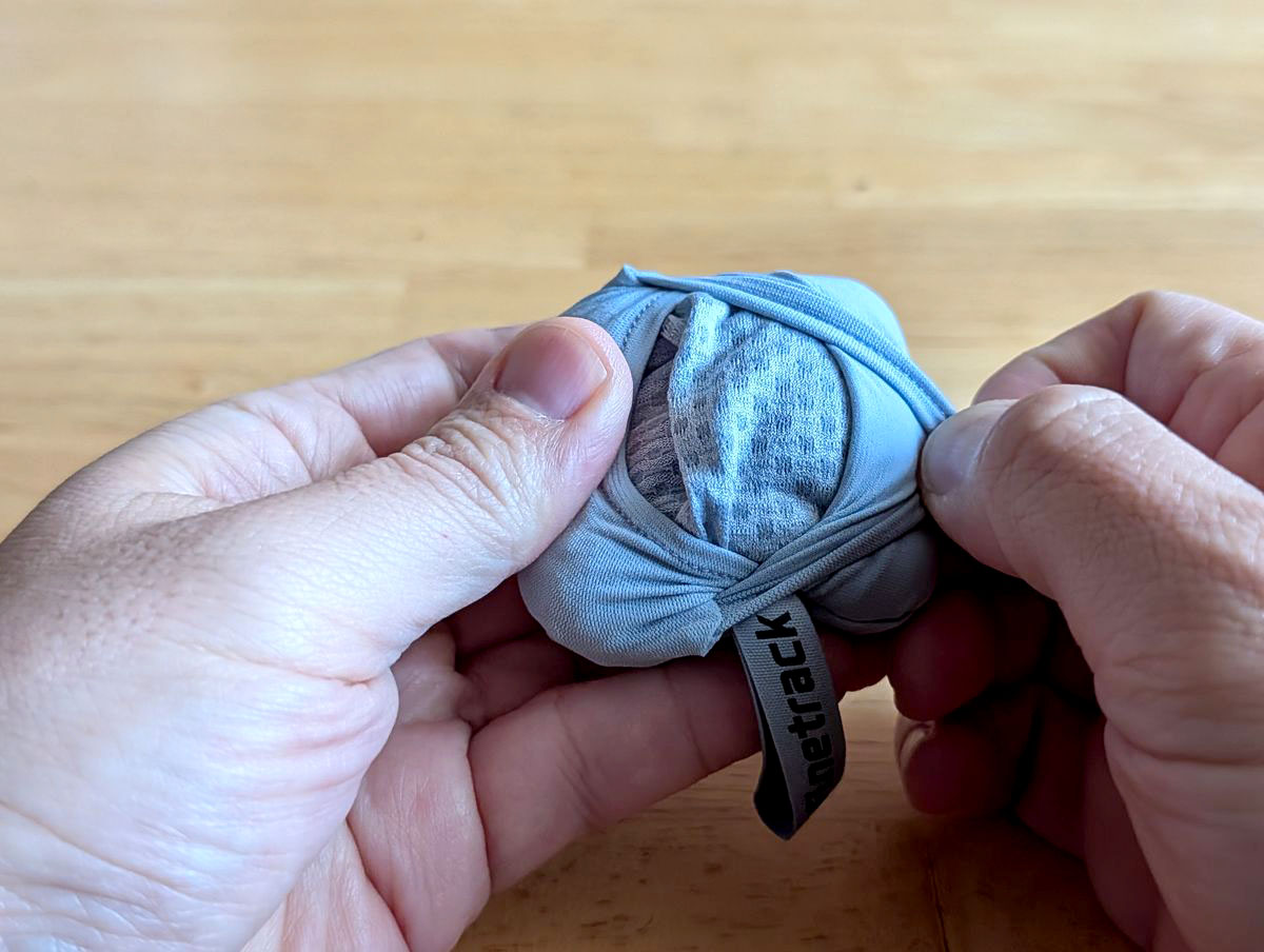 袋に収納する際も、ギュッギュッと押し込んでいけばいいだけなので、案外簡単。小さいバッグにぶら下げてあります。