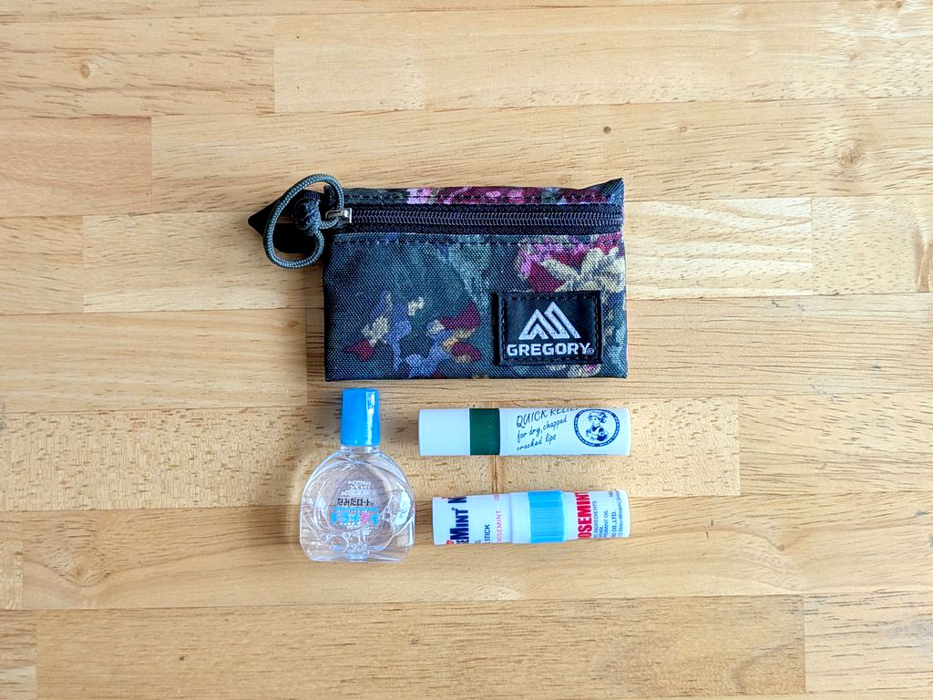 ということで、普段持ち歩いている小物を入れるポーチとなりました。花粉症の季節だったので、目薬とヤードムとリップ。