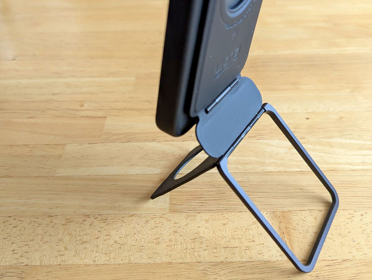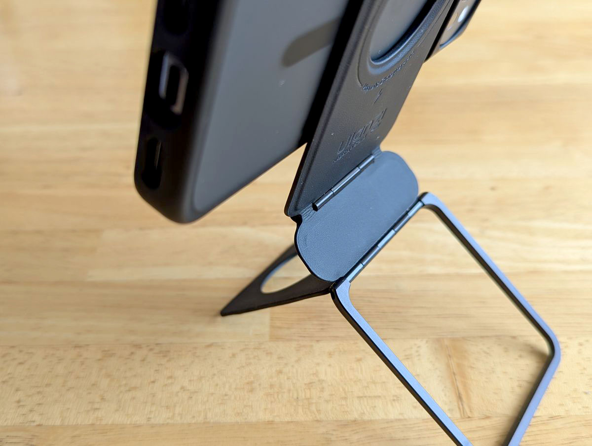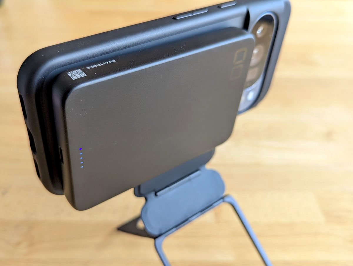 さらに、スタンドを開いた時、スマホと逆の面にもマグネットでくっつけられる仕様になっていて、MagSafe対応モバイルバッテリーも付けられます。充電速度はそれなりになっちゃいますが。