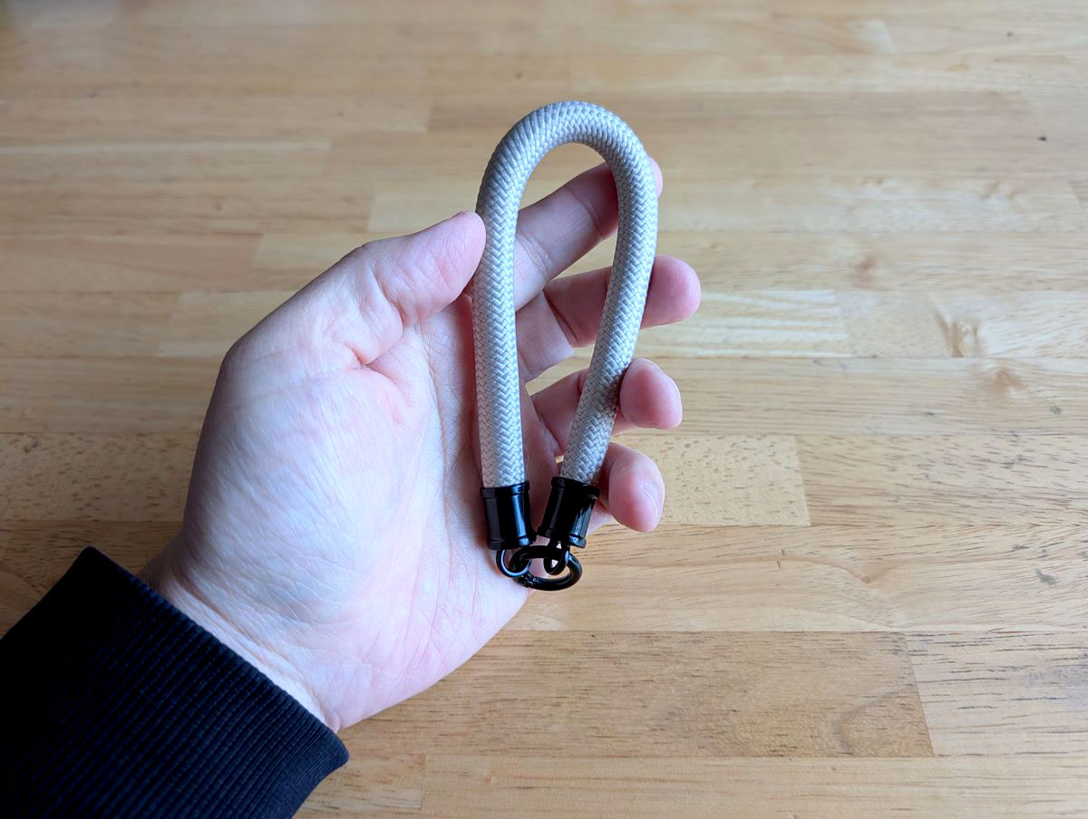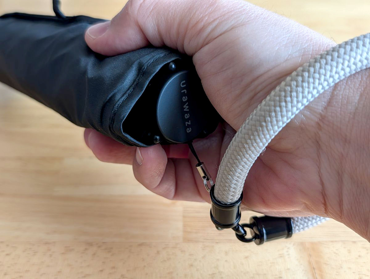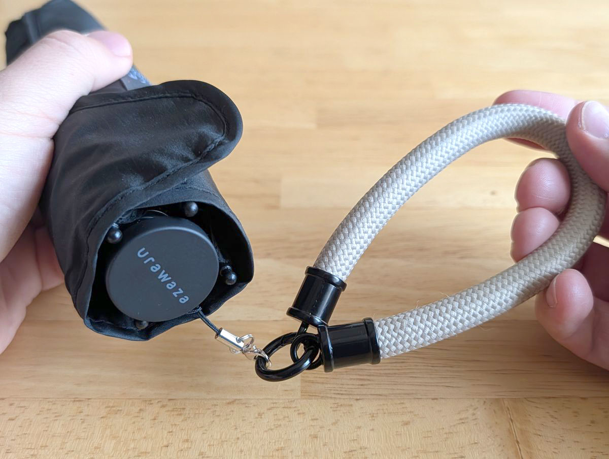 スタンダードプロダクツのハンドストラップを見つけた時に「これだ」となりました。付けてみると、ちょうどいい。手首に掛けておけば、傘を持たなくてもよくなりました。
