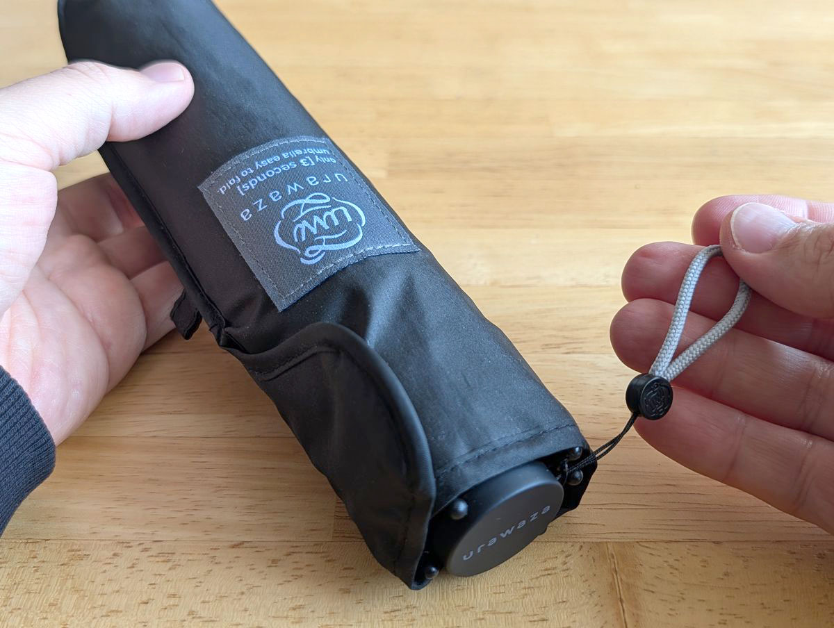 元々ストラップが付いていましたが、これがやたら小さい。折りたたみ傘って、使った直後にたたんで持ち歩く時、びしょびしょで袋に入れたくなかったりしませんか? だからストラップを巻いて親骨を縮めただけの状態で持ち歩くことがよくあるんですが、そういう時にこの小さなストラップだと持ちづらかったんです。