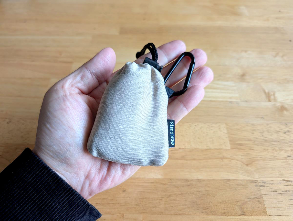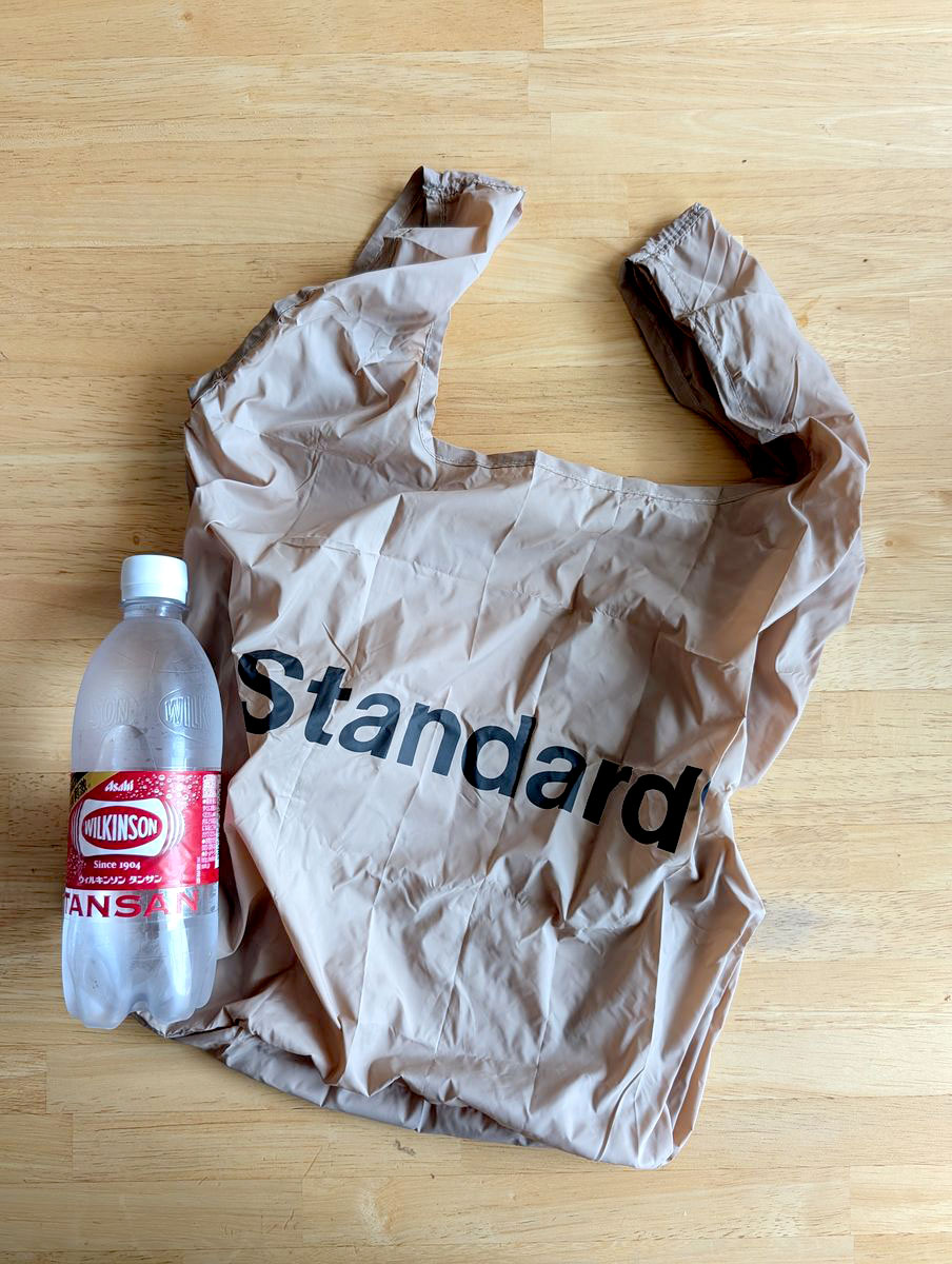 こちらもスタンダードプロダクツで見つけた一品。カラバリが多く、カラビナ付きというところがポイントです。近所歩き用に小さいバッグを使っているんですが、コンビニやスーパーで何か買い物した時にバッグに入らないモノがあったら出番です。