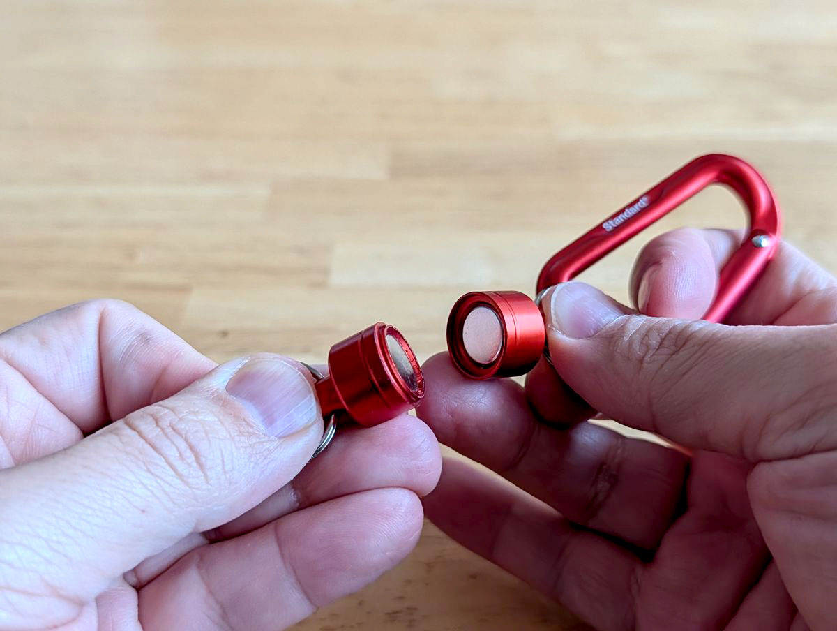 マグネットは強力で、かなり力を入れて引っ張らないと外れません。これなら外にぶら下げても使えそうですが、とはいえ大事なものをぶら下げるのは少々勇気がいるので、今回はバッグの外ではなく中で使うことに。