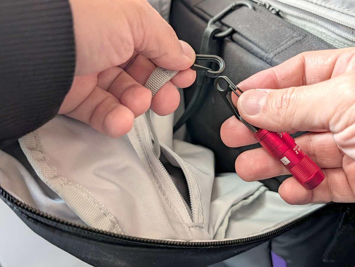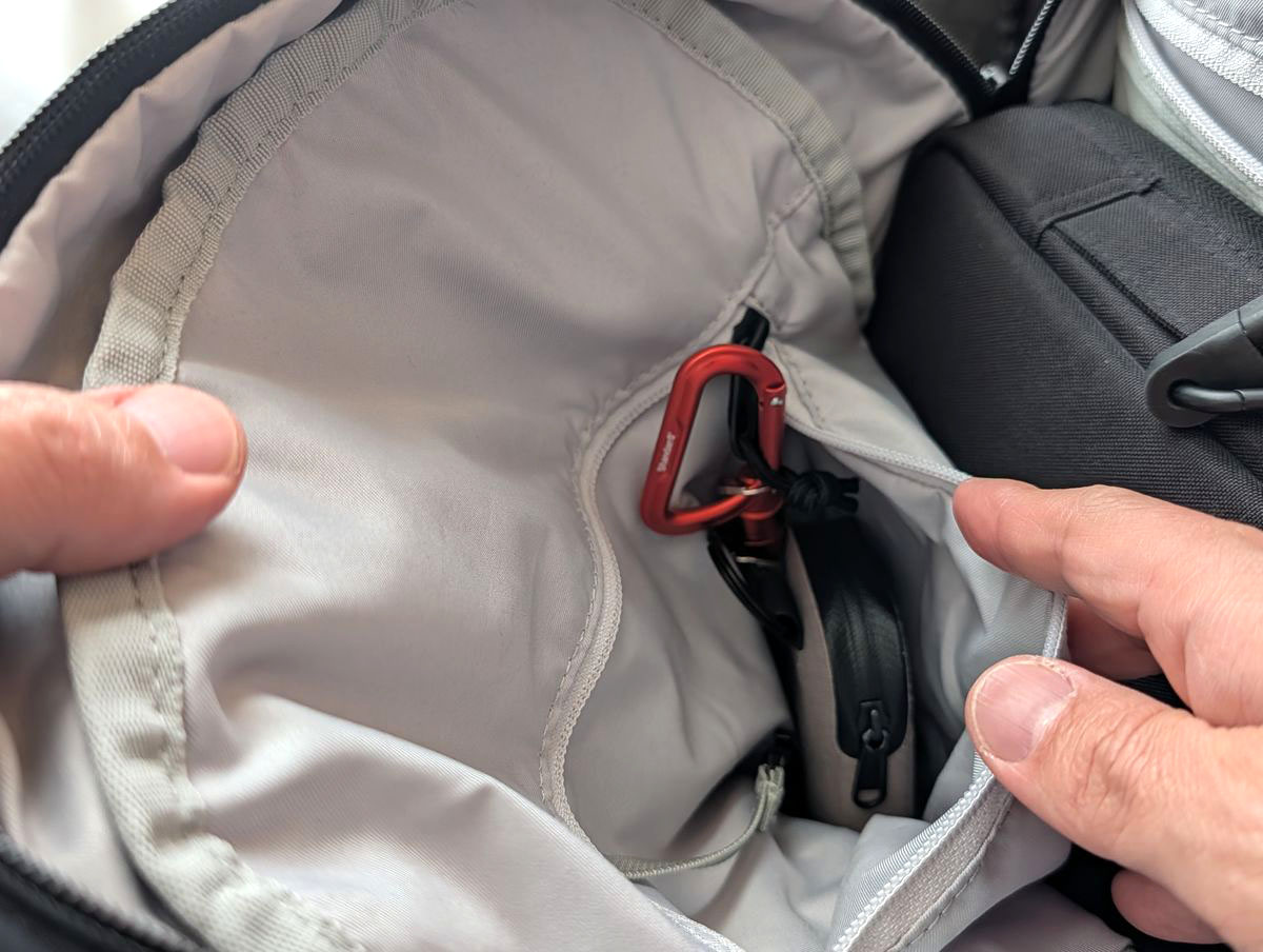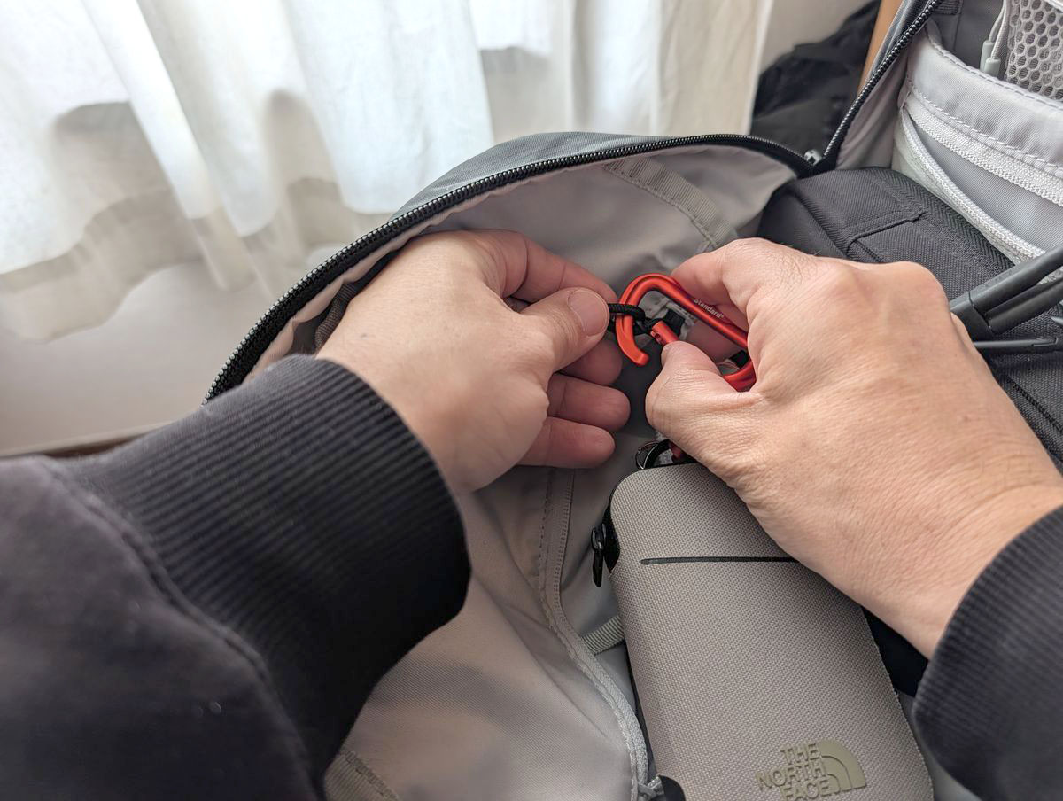 内側のファスナーポケット内にキーリーシュが付いているんですが、鍵はキーケース運用にしたことで、このキーリーシュは使っていませんでした。そこに、付属のカラビナを取り付けてぶら下げることに。