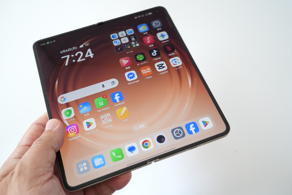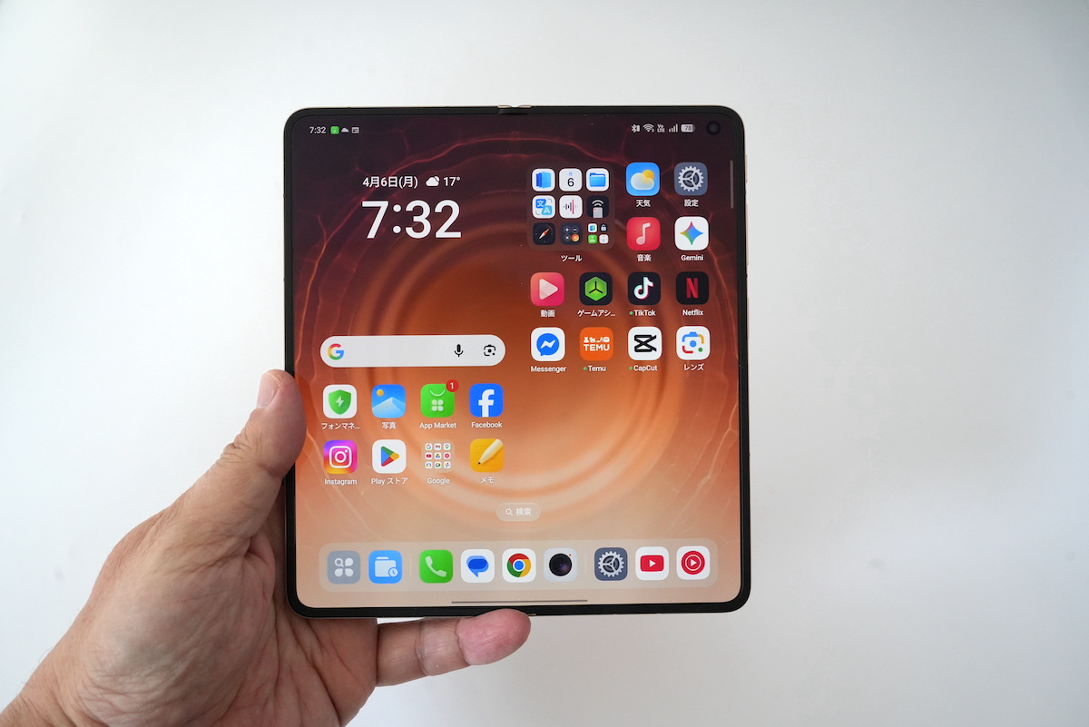 パカッと開くと約8.1インチの内側ディスプレイが現れます。折りたたみスマホのディスプレイは折り曲がる部分に凹みが生じるのですが、Find N6のディスプレイでは折り目が見えず、指でなでてもほぼフラット。この折り目が気にならないディスプレイを最大のセールスポイントとしています。