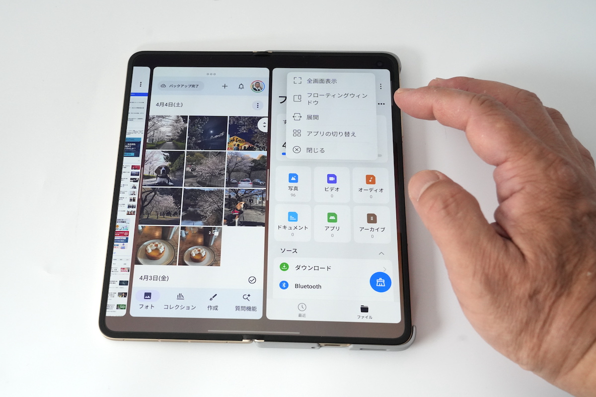 折り目が気にならないので、横向きでも縦向きでも広い画面を効率よく使えるのも魅力。画面を分割したり、ウィンドウをフローティング表示にしたりして、最大4つのアプリを同時に表示することが可能。日々タスクに追われている人には、非常に使い勝手のよいデバイスになりそうです。