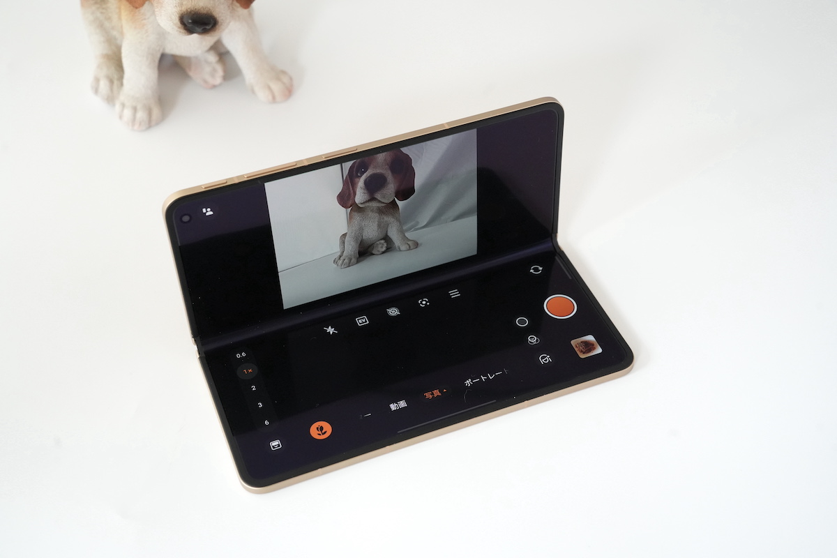外側ディスプレイの中央上と、内側ディスプレイの右上も約2000万画素のインカメラが搭載されていますが、開いた状態で高性能なアウトカメラで自撮りできることも利点。ポートレートを撮影する際に両方のディスプレイをオンにして、撮影される側にプレビューを確認してもらうこともできます。