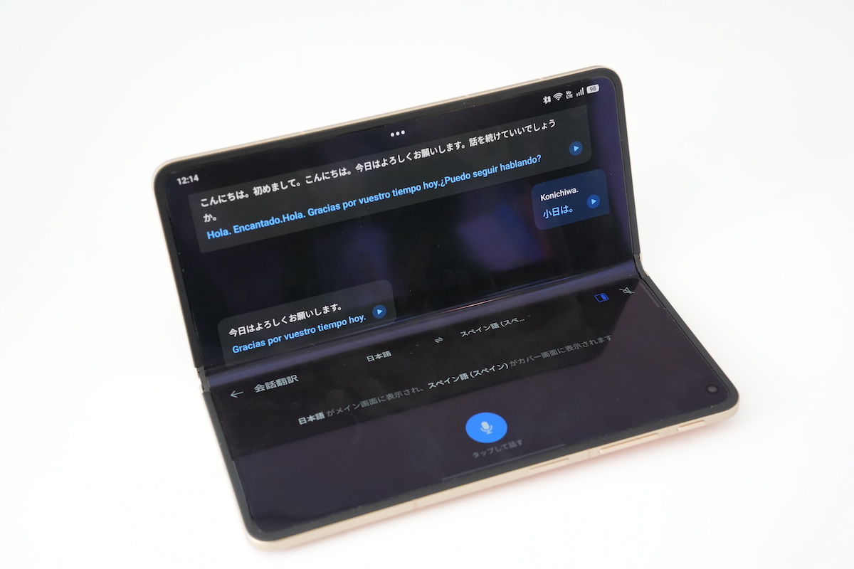 外側と内側のディスプレイを同時に使うことも可能。「翻訳」アプリを使って、外国人と話す際に、翻訳された言語を相手に見せることもできます。