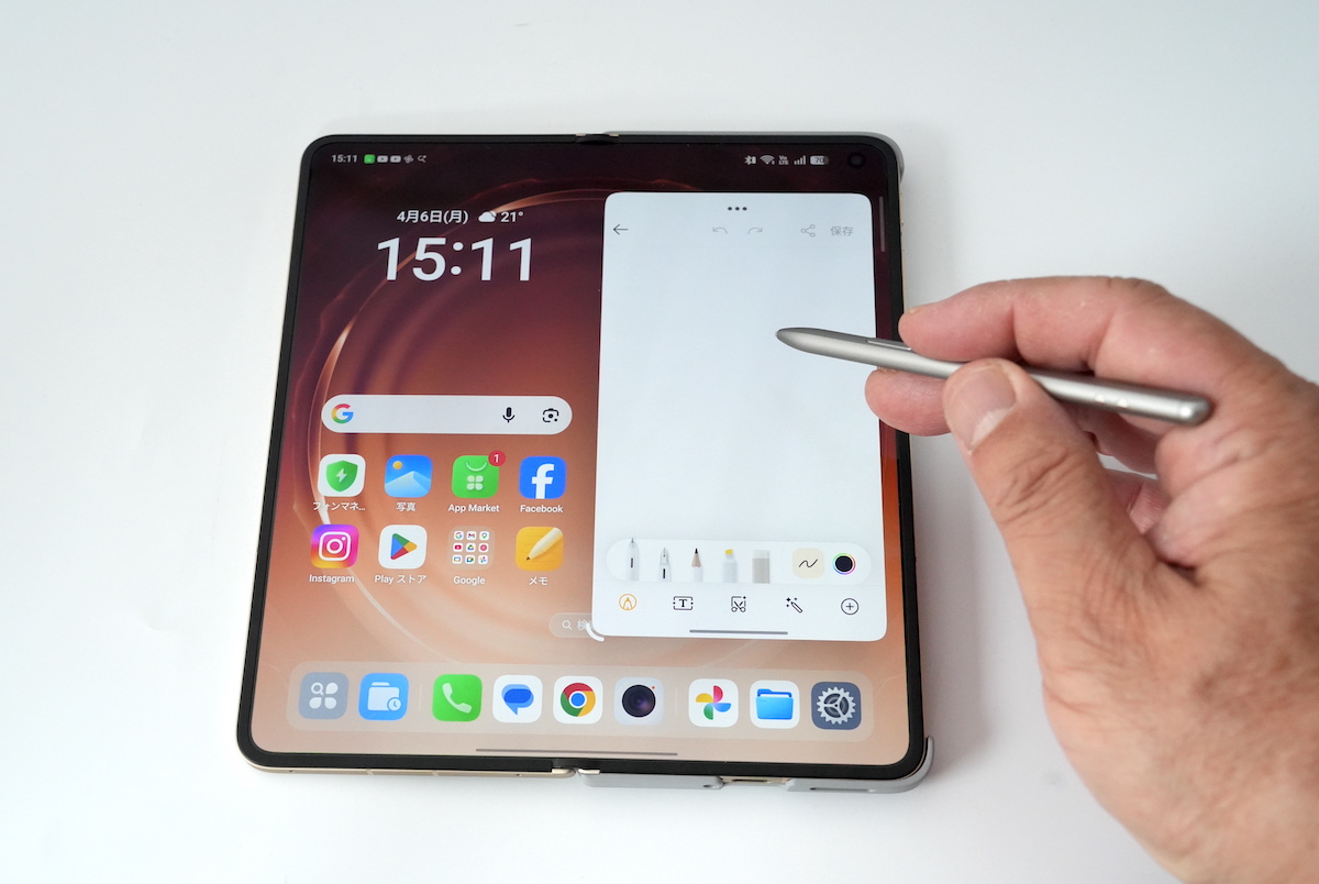 ペンの書き心地はアナログのボールペンに近い感覚。Find N6は画面が広いので、やや長めのメモでもスラスラと書きやすく感じました。画面をタップしたり、スクロールしたりといったシンプルな操作にも使えるので、作業の効率化が図れそうです。