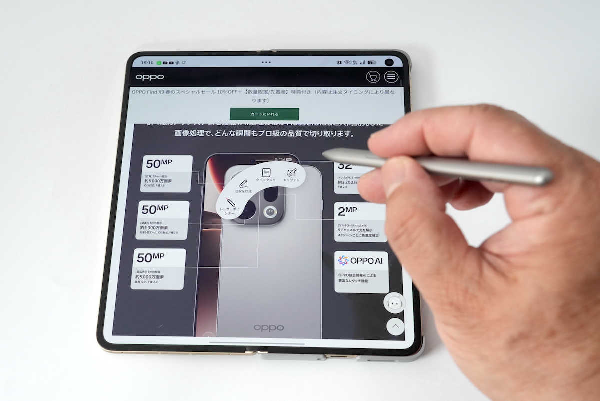 Find N6は専用のペンで操作することもできます。ペンとそれを収納できるスマホケースをセットにした「OPPO AI Pen Kit」(1万9800円)が用意されていて、これを取り付けると、常にペンを携帯でき、必要なときに取り出して使うことができます。