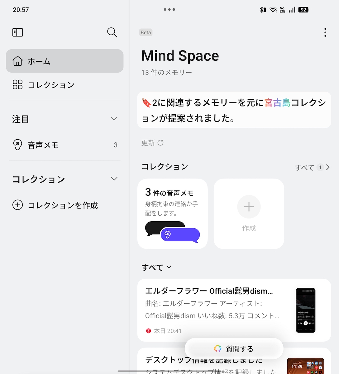 ▲「Mind Space」アプリには、スクショや音声メモが保存される。AIが情報を解析し、ユーザーへの行動提案なども行われる