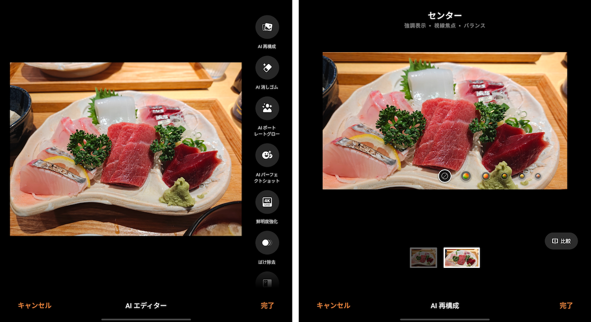 ▲「AIエディター」の「AI再構成」は、ワンタップで理想的な構図を提案してくれる