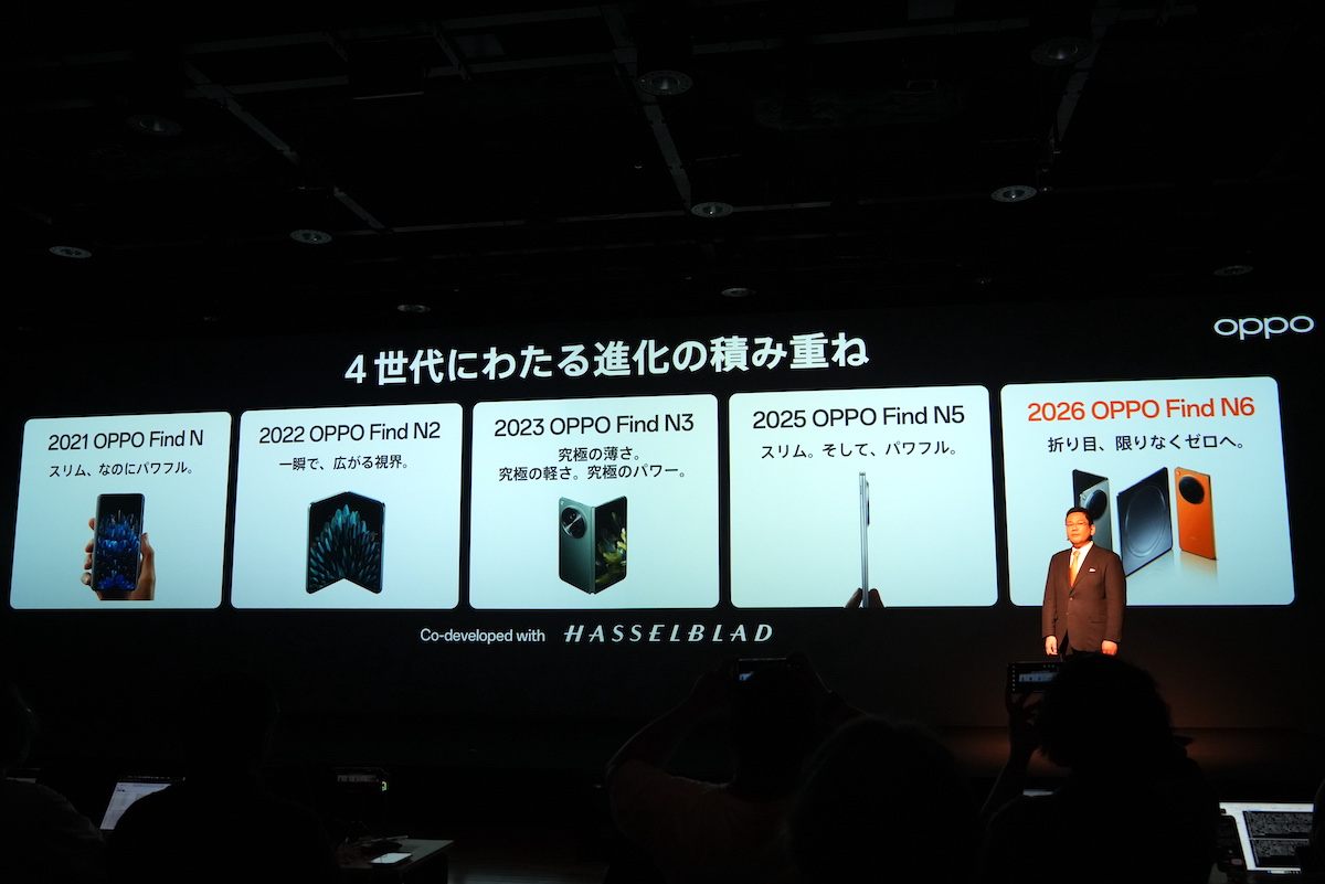 OPPOの日本法人であるオウガ・ジャパンの専務取締役、河野謙三氏によると、Find N6の日本市場への投入を決めたのは「ようやく納得できる品質を実現したから」。フォルダブルは「不安」「重い」「電池が持たない」など、興味を持ちつつも敬遠されがちでしたが、前モデルのFind N5で薄型化を実現、そして、最新のFind 6で、最後の難題であった「折り目」をフラットにすることを達成し、自信を持って提供できる製品になったとのこと。併せて、万が一保護フィルムに傷などがついた場合に無償で貼り替えてくれるサービスなど、アフターサポートが強化されることも発表されました。
