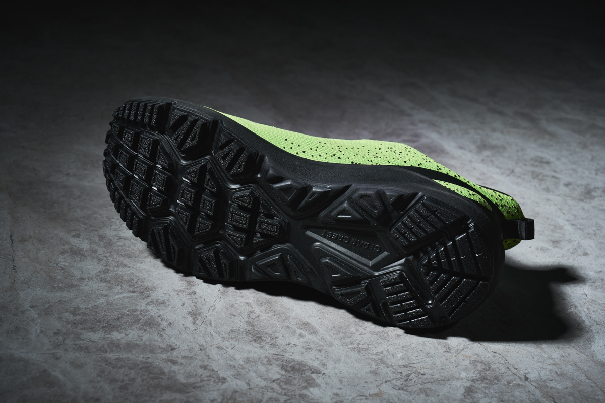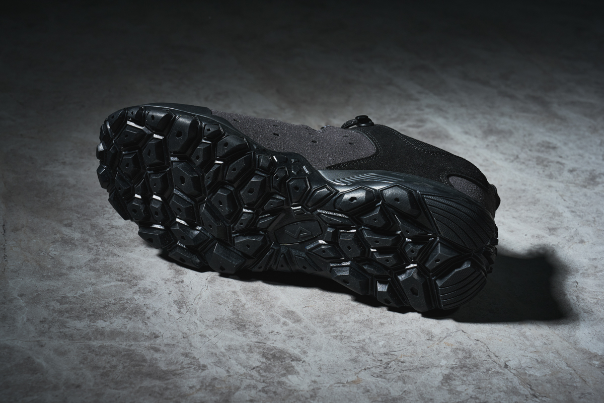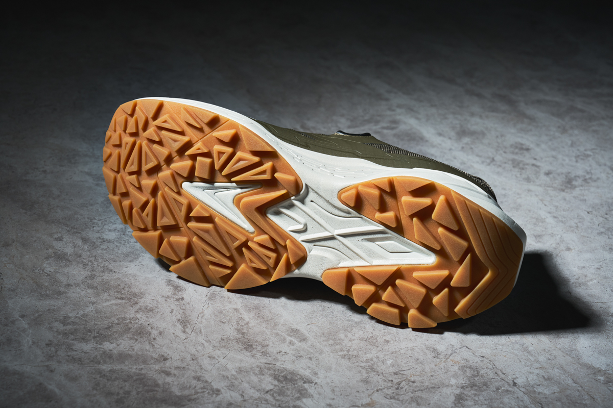 ▲TPE素材を貼り付け耐久性を向上させたアウトソールには、未舗装地をしっかり掴むラグパターンが採用
