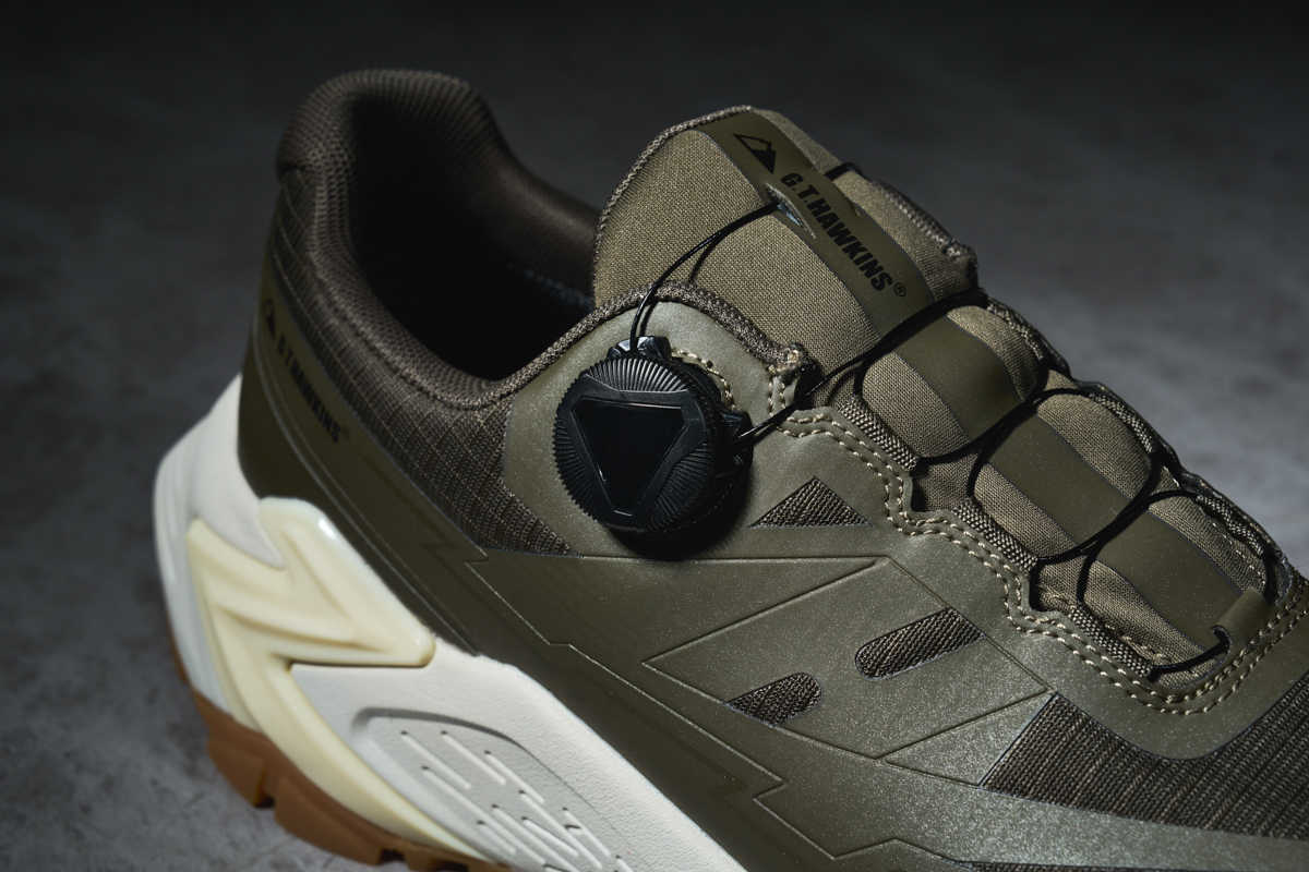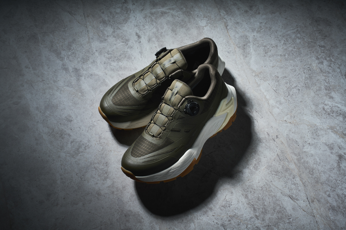 ローカットに脱ぎ履きしやすいダイヤルシステム、防水機能、落ち着いたトーンのカラーリング(写真のカーキとオールブラックの2色展開)など、雨の季節でも問題ない普段履きにピッタリなモデルになっています。