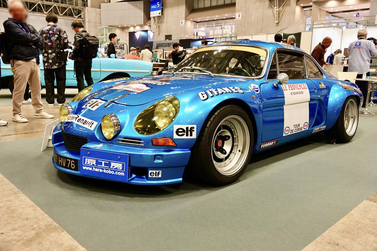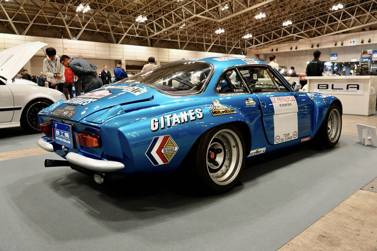 展示車両は1975年式のVD型。バルーンフェンダーを装着したラリー仕様。A110はラリーシーンで活躍し、1973年からスタートした世界ラリー選手権で初代マニュファクチャラーチャンピオンを獲得しました。2017年に登場したアルピーヌ A110がこのモデルをオマージュしたものであることは言うまでもありません。