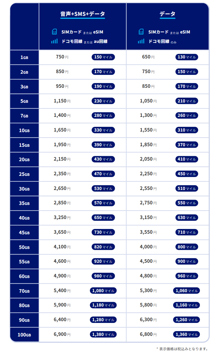 音声1GBプランなら月額750円で毎月150マイル、35GBプランなら月額2,850円で毎月570マイル。こうして数字で見ると、使ったぶんがしっかり戻ってくる感覚がかなりリアル!マイル還元分を差し引いた“実質価格”で考えると、業界最安値水準に近い価格設定と言っても過言ではありません。