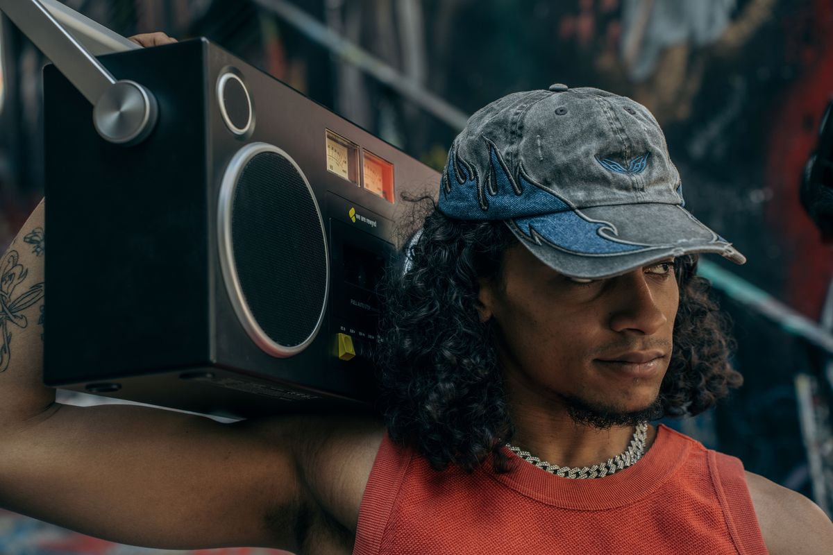 中央に備えるVUメーターとカセットデッキ、そしてガチャガチャ動かす操作ボタン。左右には大型のスピーカー(しかもツイーターは独立!)、上部にはツマミ式のノブが並び、大型ハンドルを装備。サイズはW50.6×H25.1×D17.9cm、約6.81 kgと、オーディオ機器の小型化が進む現代ではありえない大きさですが、むしろそれがアメリカのストリートで肩に担がれていた“BOOMBOX”らしさがあり、懐かしさ、人によってはレトロさを感じさせる要素にもなっています。